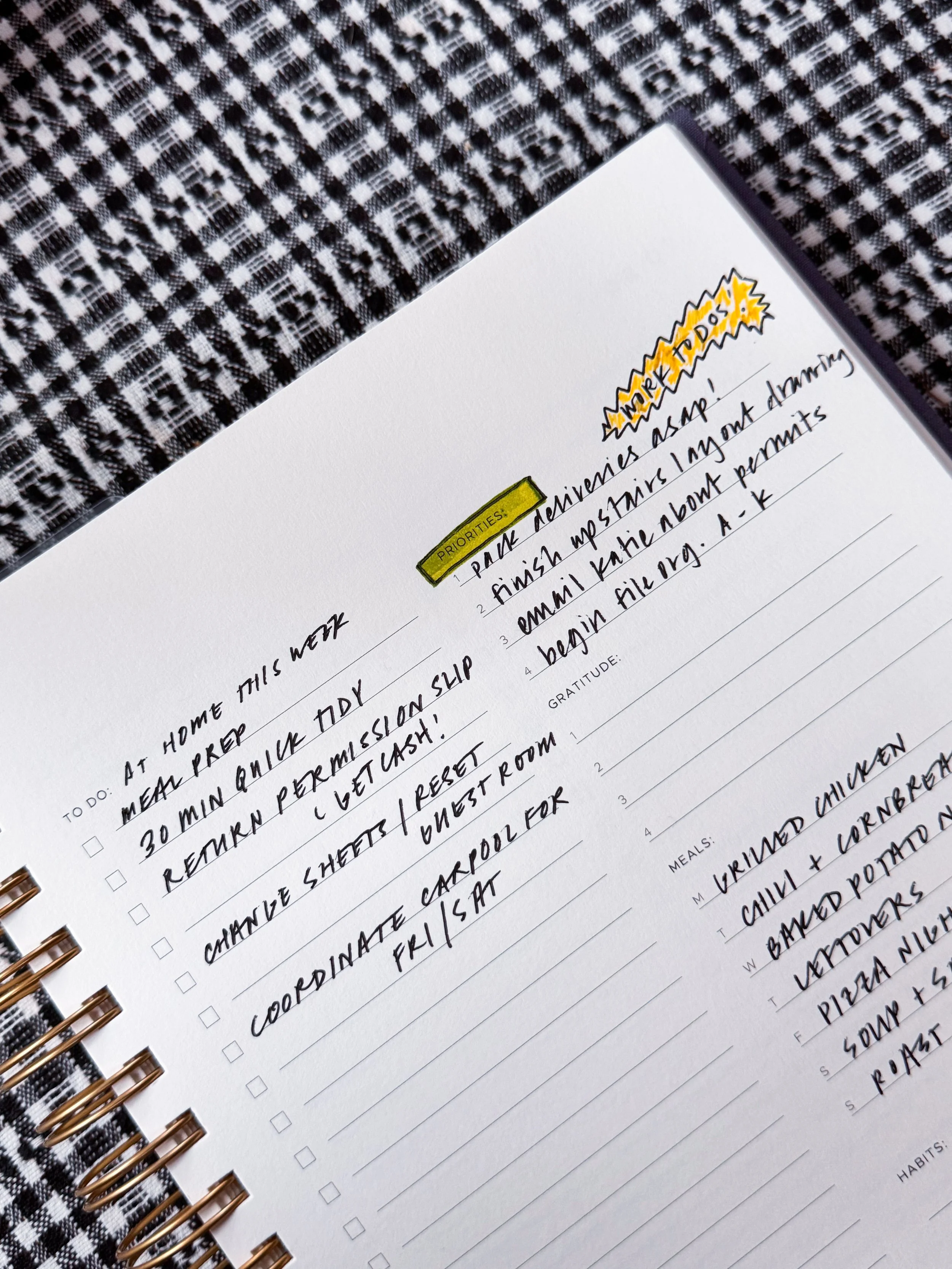 We tend to think more is better but when sitting down with your daily planner pages, choose your top 3-4 to-do items to get done that day. We love utilizing the “Priorities” section of our daily layouts for this. An endless to-do list that you never see the end of can clutter your head and keep you from completing anything. Focus on the 3-4 things that truly need to get done. Be specific in stating what you need to do. Instead of something general like, “work on the design project” get specific with a task, like, “pull four tile options for client”. Once you have these written down, make a plan to cross them off, whether that’s scheduling errands, or making time in your schedule to complete them.