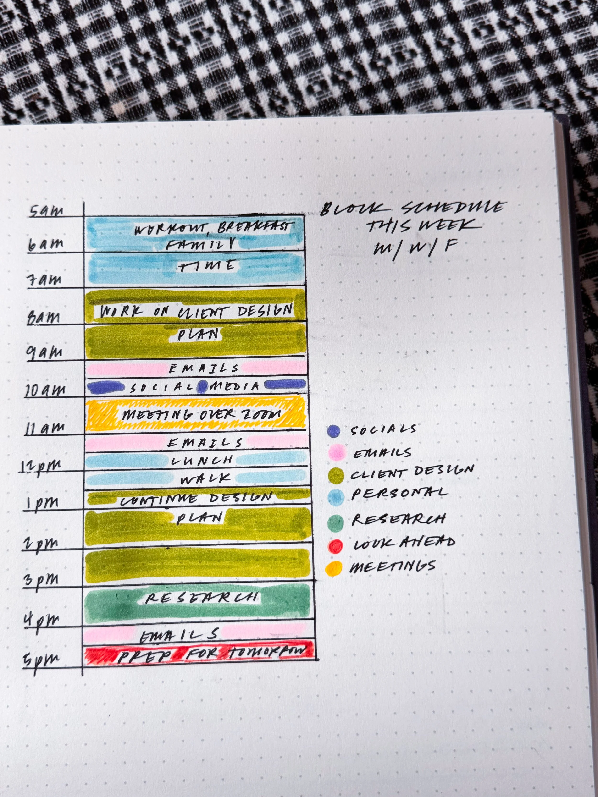 We all have limited hours in the day and usually more we want to tackle than can reasonably fit into a day. We are big fans of time blocking and share more about it here, but essentially time blocking is breaking your day down into specific time slots for specific tasks. Instead of ping -ponging around to different tasks, checking emails and social media scroll breaks, work in time blocks. It will make you much more efficient and help you stay focused on one task at a time.